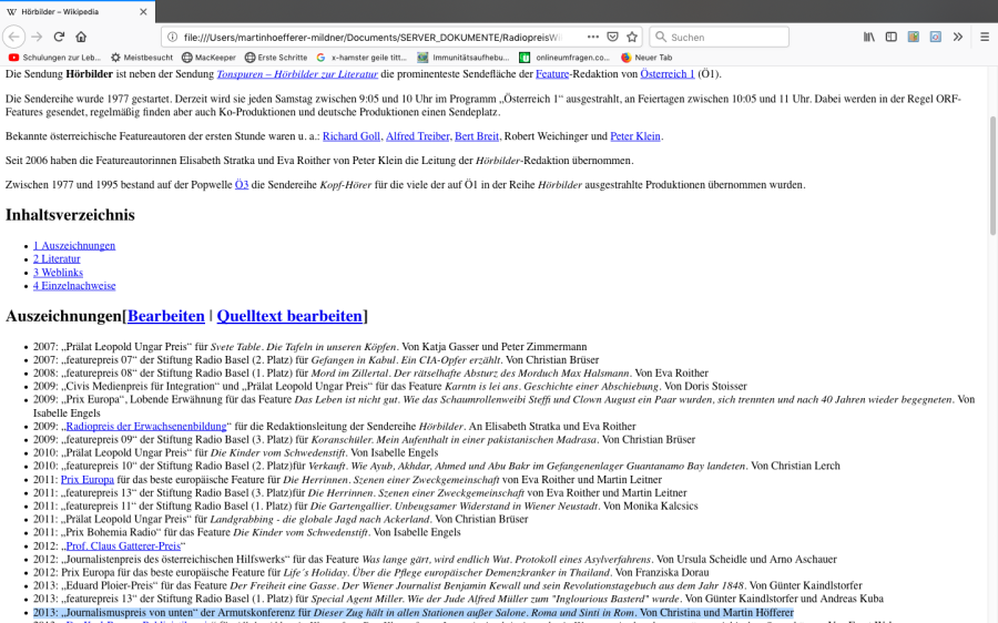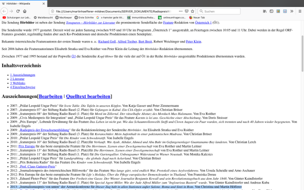 "Mi Buenos Aires Querido" Auf den Spuren der Tangolegende Carlos Gardel in der argentinischen Hauptstadt Buenos Aires ORF 2014, 15´ Ö1 Ambiente "Spaccanapoli"; eine Gasse in Neapel ORF 2011, 15´ Ö1 Ambiente Die Kinostadt. Ein Besuch in Cinecittà in Rom ORF 2012, 55´ Ö1 Ambiente Impressionen aus den Kunststädten Antwerpen, Brügge und Gent. Eine Ö1 Kulturreise zwischen Alt und Neu durch Flandern ORF 2012, 15´ Ö1 Ambiente "Bomarzo" Ein Fürst als Anarchist. Vicino Orsini und der Sacro Bosco von Bomarzo, ORF 2012, 55´ Ö1 Ambiente "Das Glück ist ein Bumerang am Montedidio". Eine Ö1 Studienreise zum Golf von Neapel ORF 2013, 10´ Schreiben bedeutet für mich mit der Erinnerung zusammen zu sein. Ein Interview in der Nähe Roms mit dem italienischen Schriftsteller Erri De Luca ORF 2013, 10´ Alle Wege führen nach Rom. Roberto Zapperi über Rom und seine Besucher ORF 2013, 10 Minuten Ein Jahr im Kloster. Marina Meuser-Kasimir in Santa Cecilia in Rom ORF 2013, 55` Ö1 Ambiente Et ego in Arcadia. Goethe in Neapel. ORF 2013, 15` ORF 2013, 55` Ö1 Ambiente Die griechische Insel Zakynthos. Insel der Dichter und Kreativen Zante. ORF 2013, 55´Ö1 Radiokolleg Cantare il Gregoriano. Zur Tradition des Choralsingens in Rom. ORF 2013, 55´ Hörbild Kraft. Mut. Erotik. Emmy Werner: Ein Portrait zum 75. Geburtstag. ORF 2013, 15` Kunst gegen die Mafia. Ein Besuch im Casoria Art Museum und in den Katakomben des Heiligen Gennaro bei Neapel. ORF 2013, 15` Im erstgeborenen Land. Ingeborg Bachmanns Rom. ORF 2013, 55` Ambiente Zwischen zwei Meeren. Eine Ö1 Studienreise durch West-Sizilien. ORF 2013, 7` Kulturjournal Der Prix Europa ORF 2013, 55` Hörbild Der Schlangenbeschwörer. Astor Piazzolla. ORF 2014, 15` Mein Leben ist mein Werk. Die Villa Ocampo in San Isidro, Buenos Aires. ORF 2014, 55` Ö1 Radiokolleg Das Vatikanische Geheimarchiv. Eine Erkundung. ORF 2014, 15` Der Inselkaiser. 200 Jahre Napoleon auf Elba. ORF 2014, 15` Der Philosoph im Exil auf Fuerteventura. Ein Besuch im Miguel de Unamuno-Museum in der Hauptstadt von Furerteventura "Puerto del Rosario". ORF 2014, 55` "Unbeugsam" Der Dichter und Filmemacher Pier Paolo Pasolini. Preis Radiofeature: ORF 31. Mai 2013